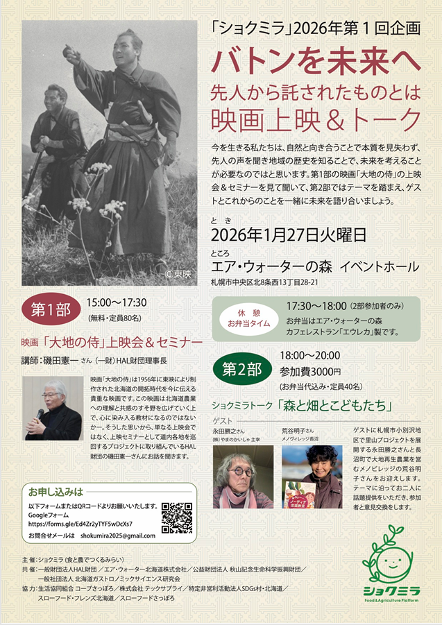 秋山財団関係者・ネットワーク形成事業助成受領者を中心として結成されたプラットホーム「ショクミラ(食と農でつくるみらい)」から2026年第1回目のセミナー“「大地の侍」上映&トーク”のご案内です。皆さまお誘いあわせの上、ぜひご参加ください。