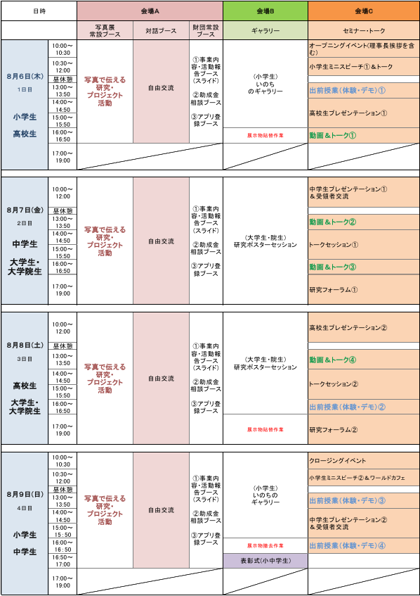 1.助成金受領者による体験型プログラム当財団助成金受領者が専門的な研究内容や活動の魅力を地域の若い世代や一般の方々にわかりやすく伝え、財団の取り組みを多様な市民に広く発信します。小中高校生、大学生・大学院生が参加できる数々のプログラムをご用意しています。 ※①②の詳細ついては■タイムテーブルをご確認ください