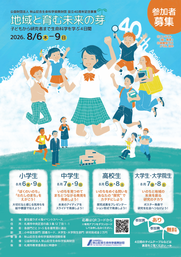 本年、財団設立40周年を迎えるにあたり記念事業として、財団の歩みや助成事業の成果を広く市民に発信するとともに、若い世代に生命科学(いのち)の魅力を伝えるイベントを開催いたします。