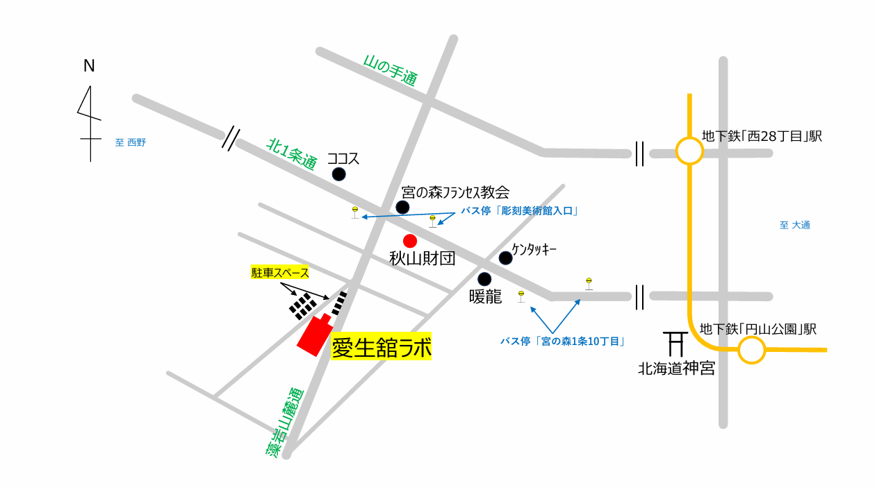 ▶車でお越しの方 〒064-0953 札幌市中央区宮の森3条12丁目1-1 愛生舘ラボGoogle maps ※駐車場は約30台分のスペースがございます ▶公共交通機関でお越しの方