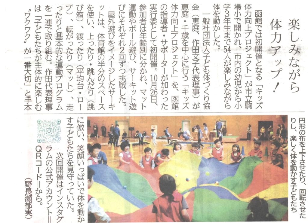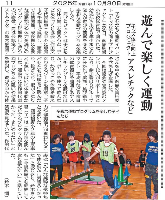 幼児~小学3年生までの運動啓発プロジェクトが2025年10月26日に函館市で実施され、54人の児童が楽しみながら体力向上を図りました。その様子が函館新聞・北海道新聞に掲載されましたのでご紹介いたします。函館のプラットホームメンバーを中心に初めて行われたこの活動は3月より定期開催することになりました。コロナ禍を乗り越えて継続的に活動していたことで他地域への拡がりを見せています。2026.1より、新名称「一般社団法人子どもからだづくりアシスト」になりました。https://www.kodomo-k.org/