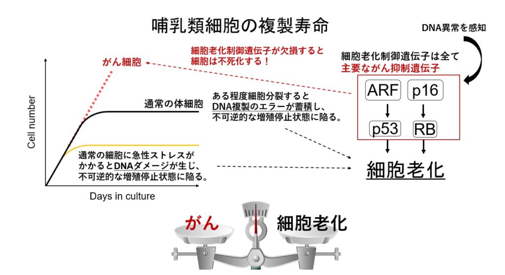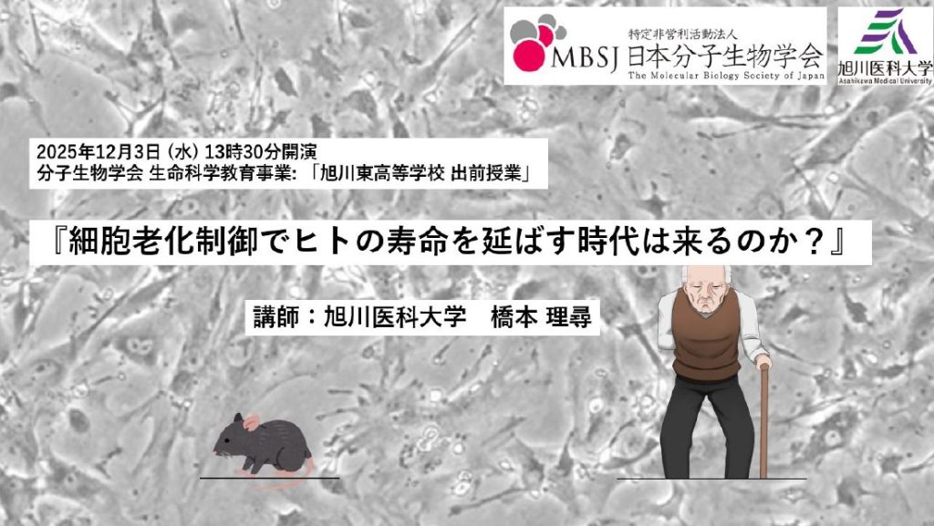 分子生物学会のご助力を得て、2025年12月3日(水)旭川東高等学校にて1年生を中心とした約50名に『細胞老化制御でヒトの寿命を延ばす時代は来るのか?』という表題で、細胞老化と発がん性の切っても切り離せない因果関係<老化とがんの天秤>について約90分の講義を行いました。