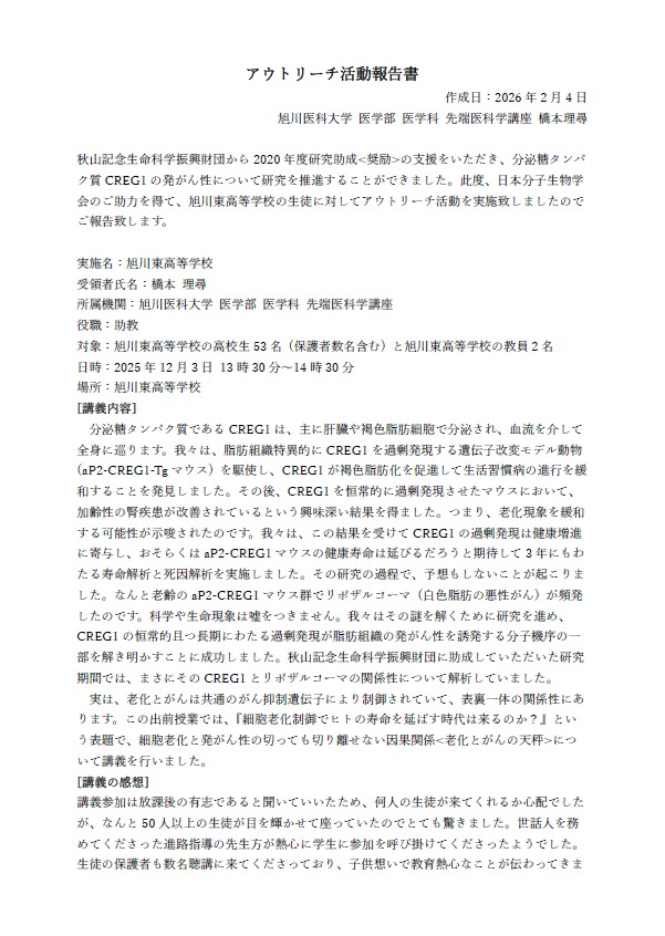 旭川医科大学医学部医学科先端医科学講座・助教 橋本理尋 先生(2020年度研究助成(奨励))によるアウトリーチ活動をご紹介いたします。
