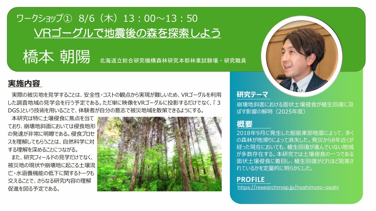 「VRゴーグルで地震後の森を 探索しよう」 北海道立総合研究機構森林研究本部 林業試験場・研究職員 橋本 朝陽 先生 |