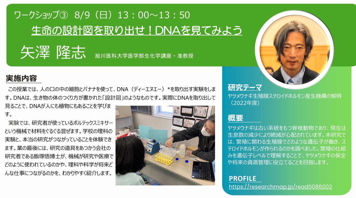 「生命の設計図を取り出せ! DNAを見てみよう」 旭川医科大学医学部生化学講座・准教授 矢澤 隆志 先生 |