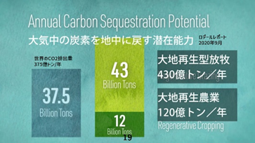 大地再生(リジェネラティブ)農業は、土に住む生き物の働きを邪魔しないために、耕耘を最小限にすることや肥料を入れない農業ですが、そうすることで大気中の二酸化炭素が植物の体を通して根の先から液体炭素として土の中に貯留されていくことがわかっており、地球温暖化問題の解決策ともなる農業です。